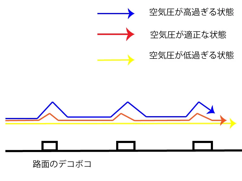 路面環境とタイヤのセッティングがあっていないと、様々な影響が出てきます。まず、高すぎる空気圧です。