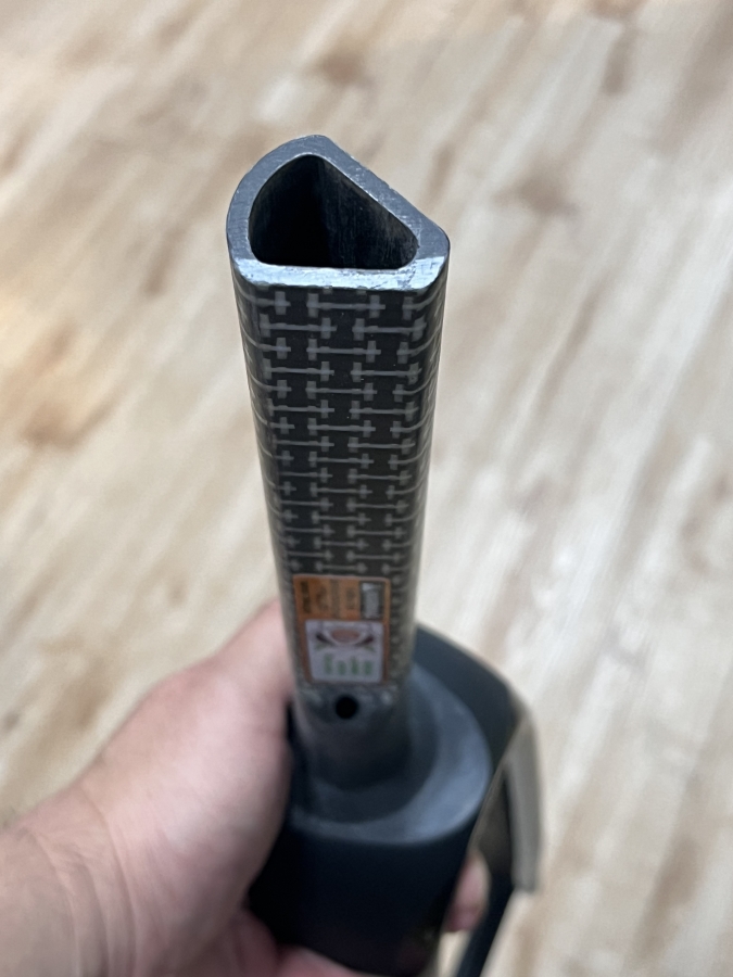 スーパーシックスエボ最大の特徴は「デルタステア―」と呼ばれる三角形のフォークコラムになります。