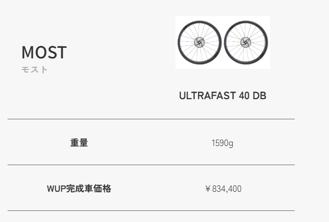 MOSTウルトラファスト40は驚異の¥149,600円引き!!元々が¥264,000(税込み)なので性能は申し分ないホイールなのです。¥114,400のアップチャージでカーボンホイールが来るのなら、WUPではMOSTがもっともコスパのいいアップグレードになりそうですね。