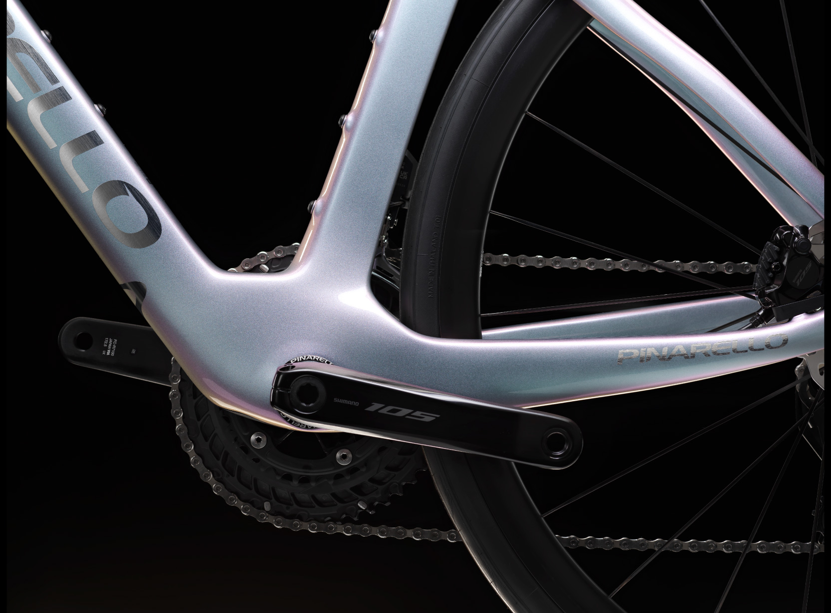 新しいFシリーズ/DOGMA Fのダウンチューブの角度は3.5°上向きになり、ボトムブラケットエリアのエアロ性能を1.2%向上させるキール(舟底)形状となっている。前作F/DOGMA Fに比べて容積を削減し、剛性を向上。より洗練された外観を実現。タイヤクリアランスは32mmに拡大され、よりワイドなリムやタイヤを使用できます。