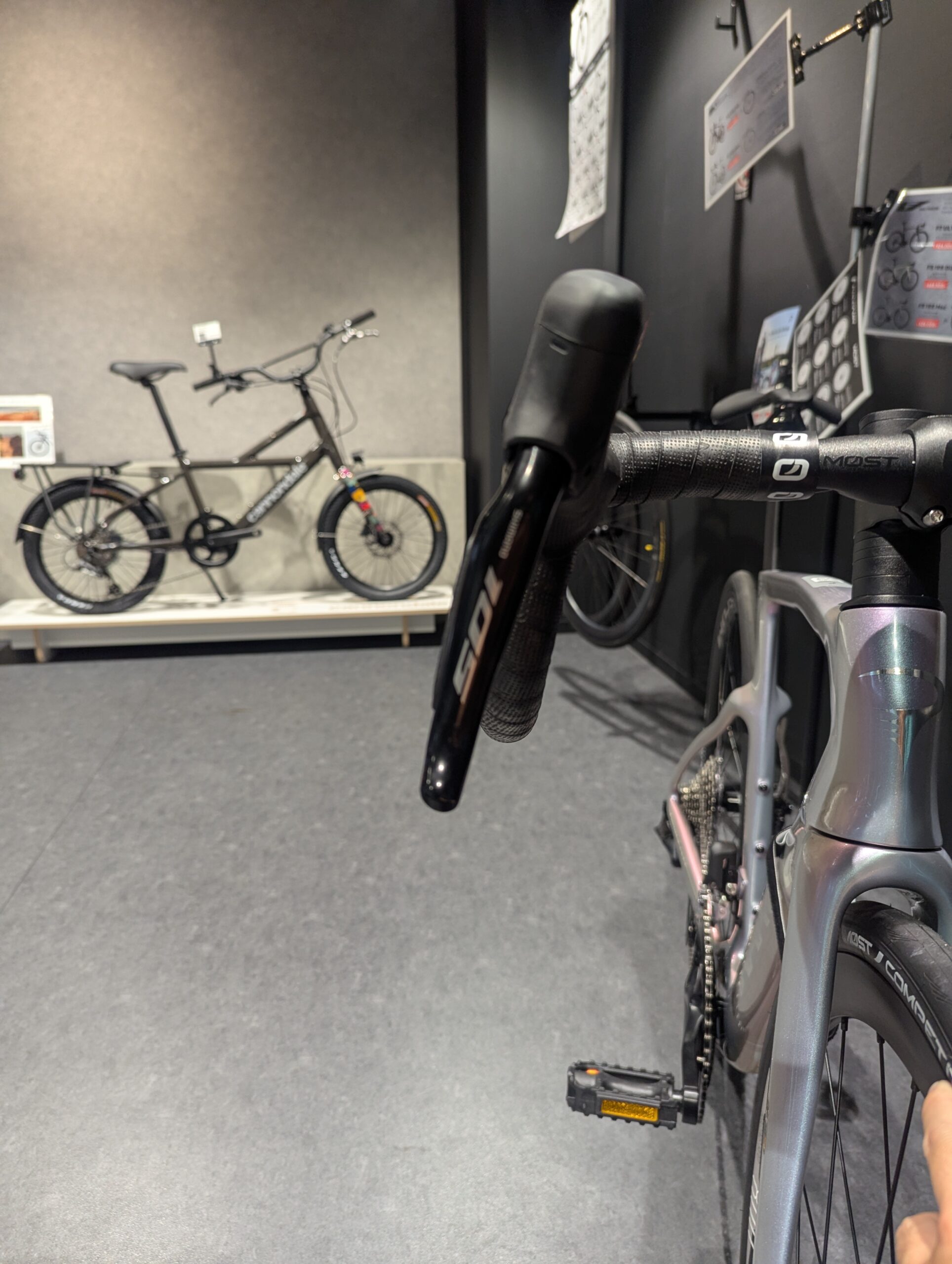 当店でもPiNARELLOは人気車種で、しばらく店頭在庫分がすべて完売と言う状況でした。そんな時入荷してきた新型F5。実際に乗ってその性能を体感することもできます。