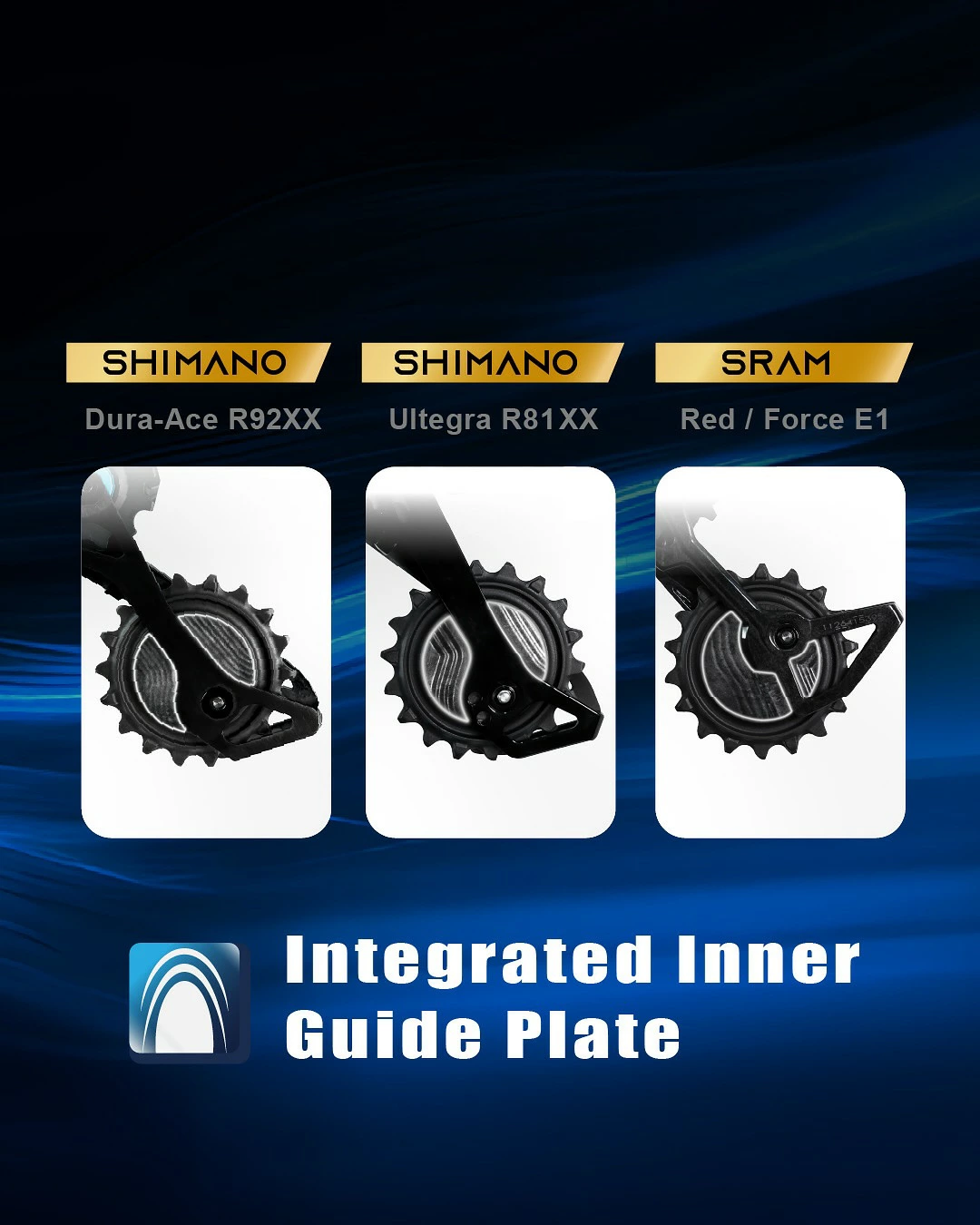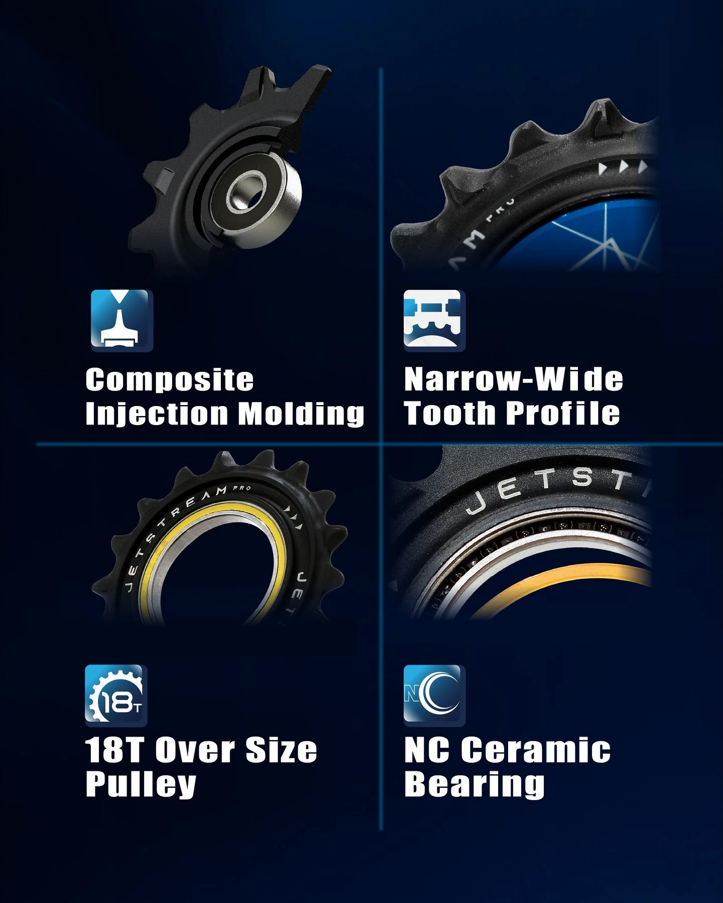 ジェットストリームプロ AOPW-AERO Kitsのプーリーは、より強固に、ナローワイド形状を一新することで高いチェーン保持力を実現しています。しっかりチェーンを保持してG3ベアリングで超速回転することで、ライダーのペダリングをサポートしてくれます。